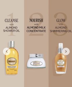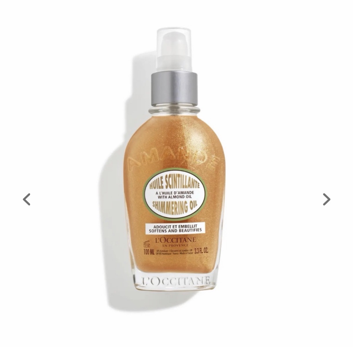 The silky Almond Shimmering Oil absorbs quickly into the skin, helping to nourish, soften, and beautify, leaving a subtle veil of shimmer.